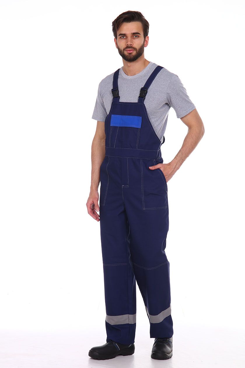 ➠ Полукомбинезон с застежкой гульфика на тесьму «молния» и в правом боковом шве на пуговицы. Накладные карманы с наклонным входом. В области коленей усилительные накладки. На груди накладной карман с клапаном. По низу брюк СОП 50 мм.