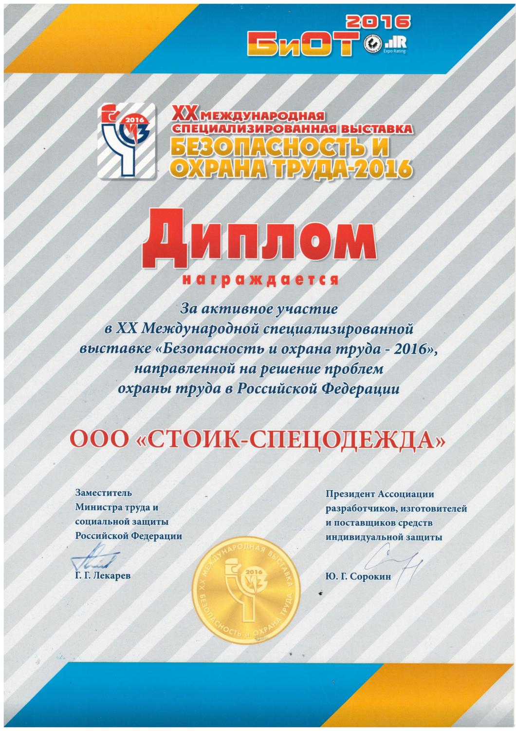 Диплом за активное участие в 20-й в международной специализированной выставке "Безопасность и охрана труда 2016".